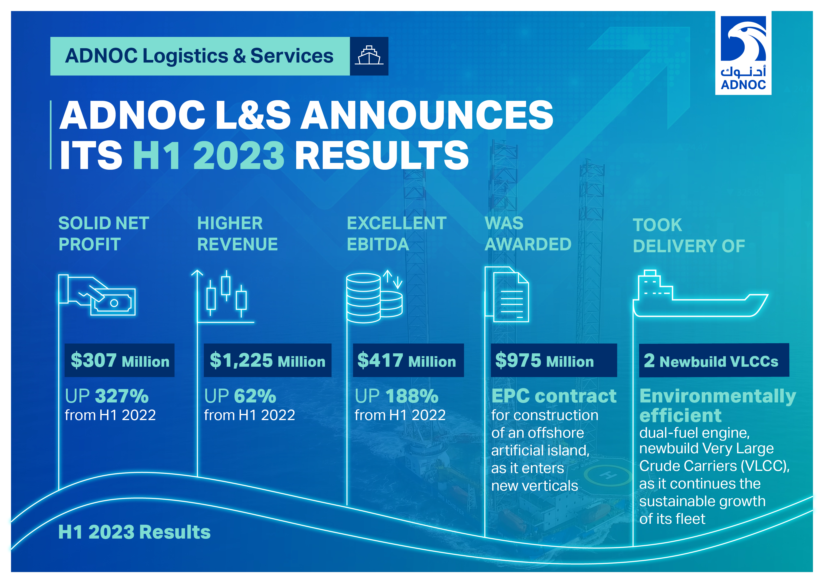 Abu Dhabi, UAE – August 3, 2023: ADNOC Logistics and Services plc (ADNOC L&S) (ADX symbol ADNOCLS / ISIN AEE01268A239), a global energy maritime logistics leader, today announced exceptional financial results for the first half of 2023, marking its maiden earnings report since its record-breaking IPO in June 2023 on the ADX exchange.
