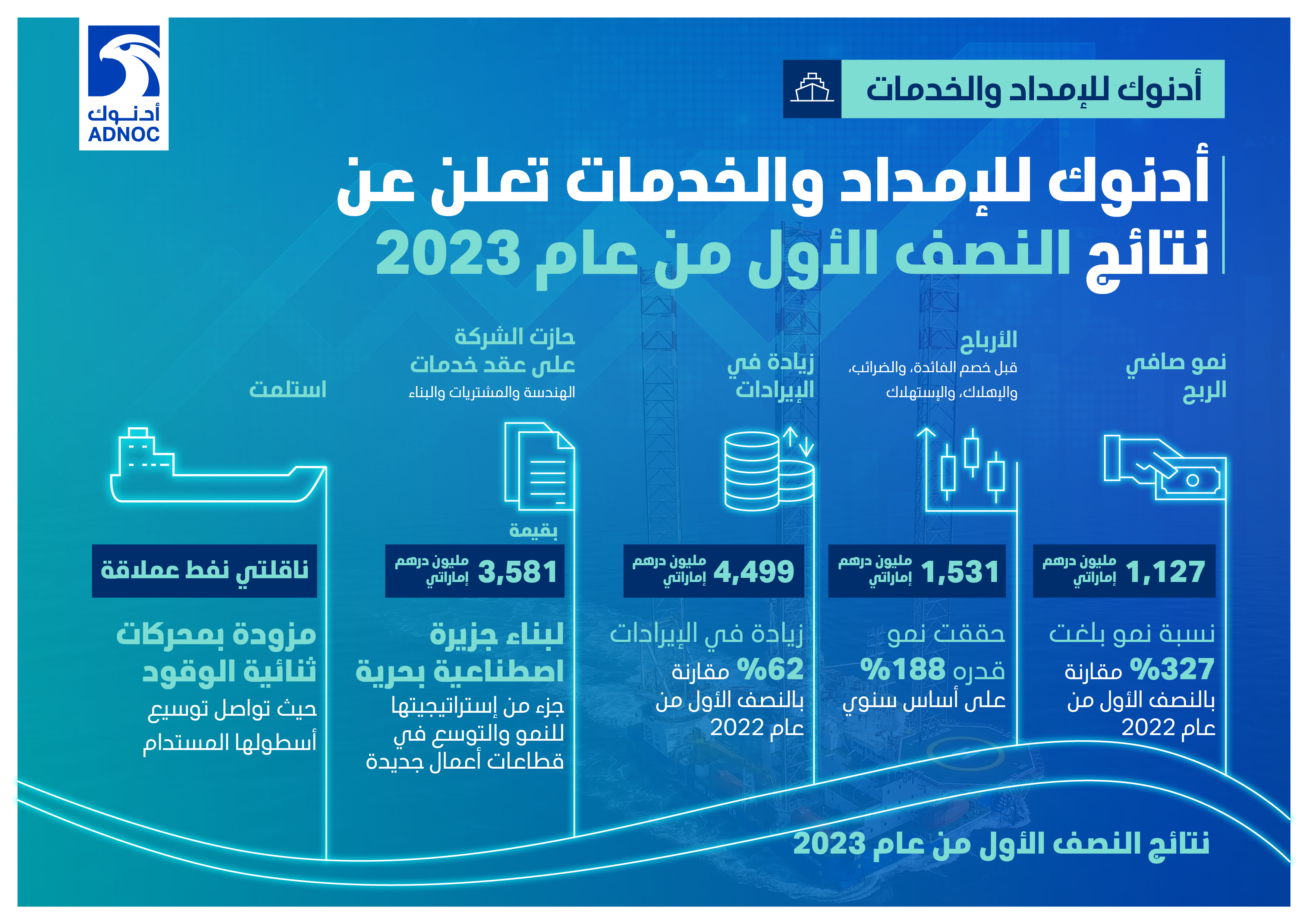 أبوظبي - الإمارات العربية المتحدة –3 أغسطس 2023: أعلنت "أدنوك للإمداد والخدمات"، الشركة الرائدة عالمياً في مجال الخدمات اللوجستية والبحرية لقطاع الطاقة، والتي يتم تداول أسهمها تحت الرمز "ADNOCLS" ورقم التعريف الدولي “AEE01268A239”، اليوم عن نتائجها المالية الاستثنائية للنصف الأول من عام 2023، وهي أول نتائج تُعلن عنها الشركة منذ الاكتتاب العام القياسي على أسهمها في يونيو 2023 في سوق أبوظبي للأوراق المالية.