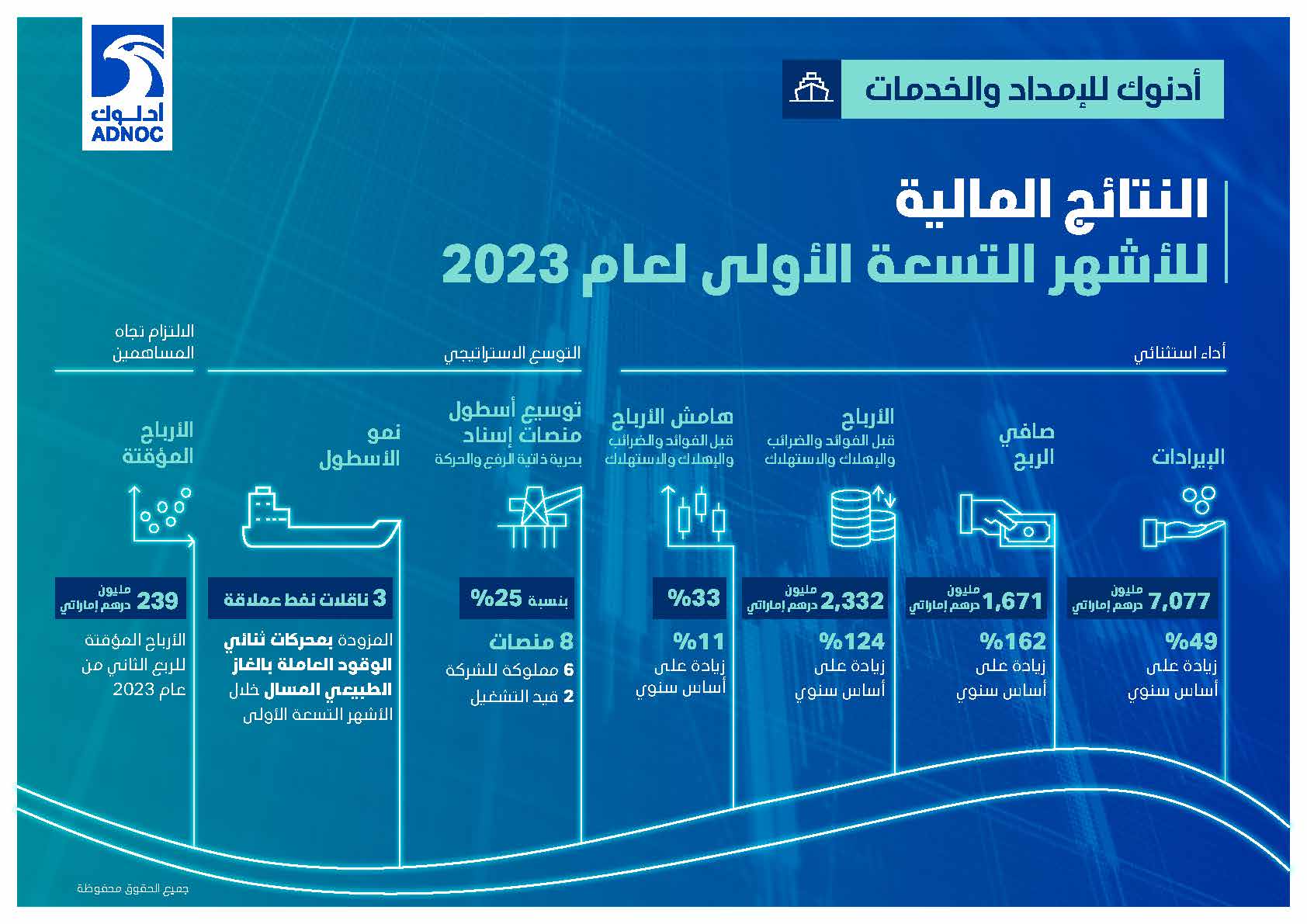 أبوظبي - الإمارات العربية المتحدة - 13 نوفمبر 2023: أعلنت "أدنوك للإمداد والخدمات بي ال سي"، الشركة الرائدة عالمياً في مجال الخدمات اللوجستية والبحرية لقطاع الطاقة، والتي يتم تداول أسهمها في سوق أبوظبي للأوراق المالية تحت الرمز "ADNOCLS" ورقم التعريف الدولي "AEE01268A239"، اليوم عن نتائجها المالية الاستثنائية للأشهر التسعة الأولى من عام 2023.